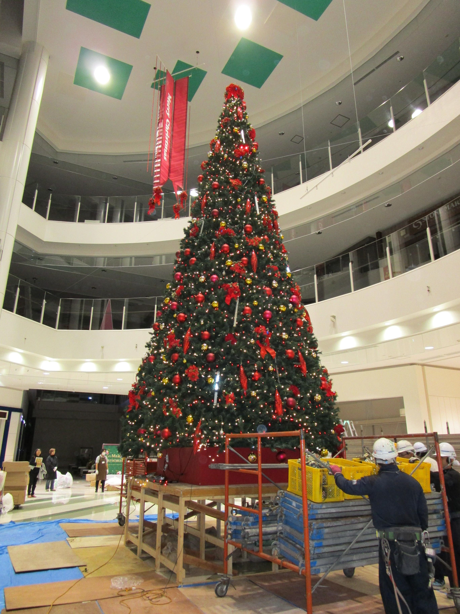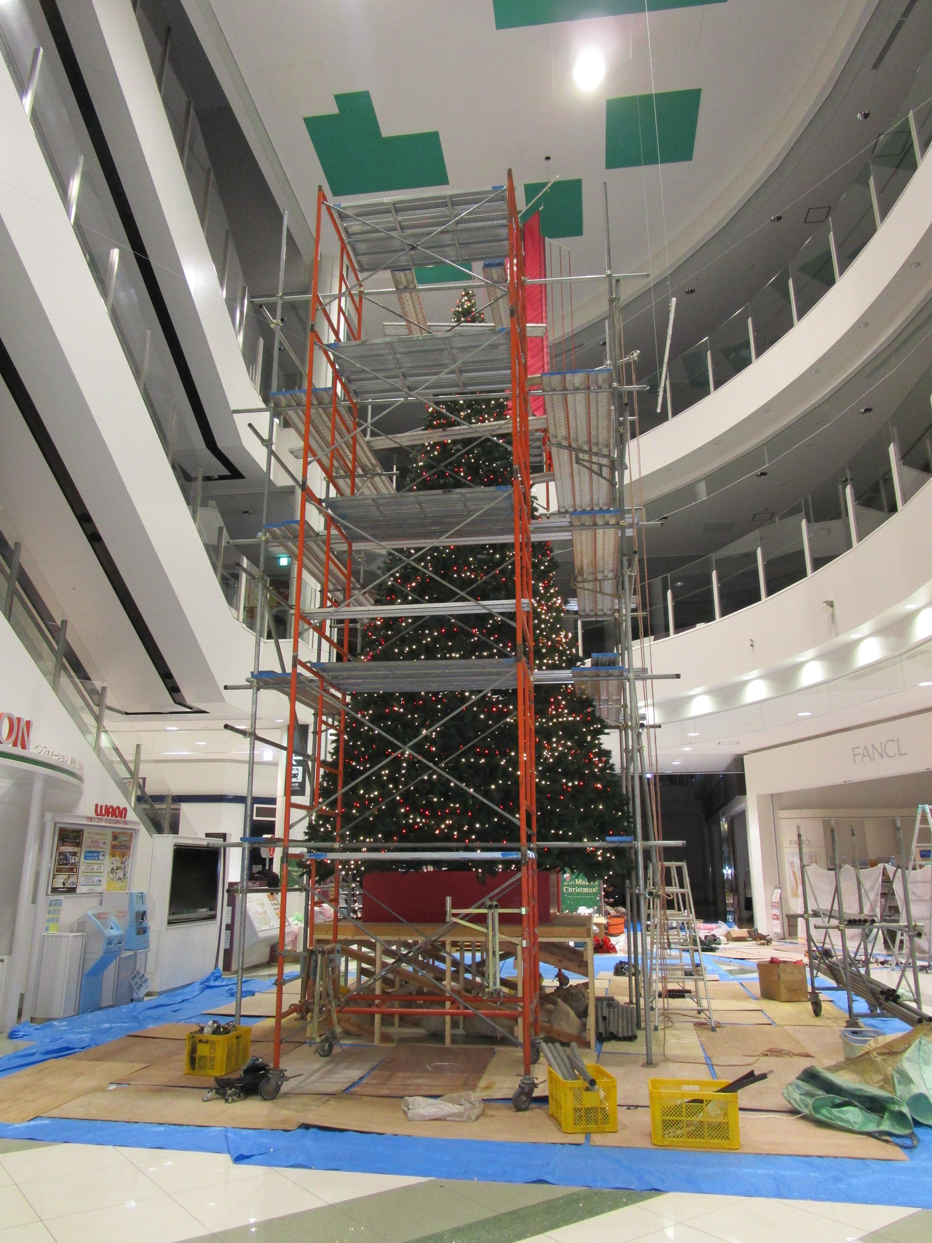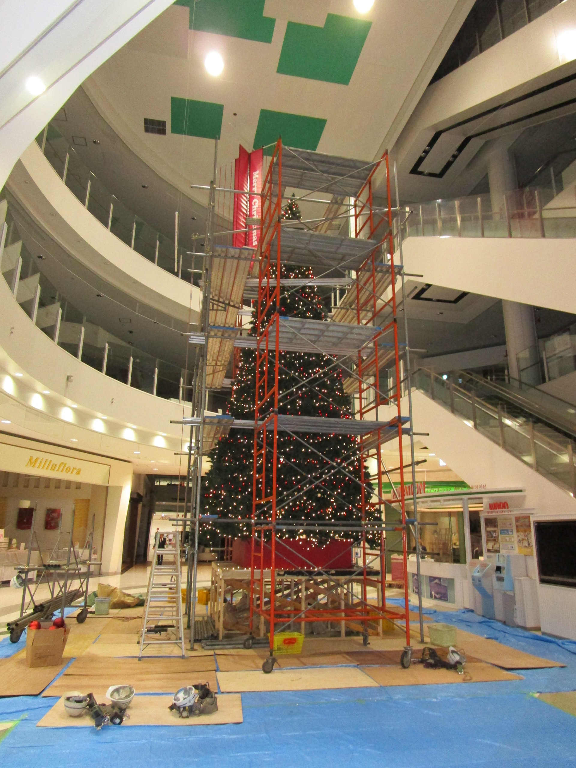 ショッピングモール営業終了後からスタートして、足場の搬入、足場の設置、クリスマスツリーの施工、足場解体、搬出まで、翌朝の営業開始までに完成します。