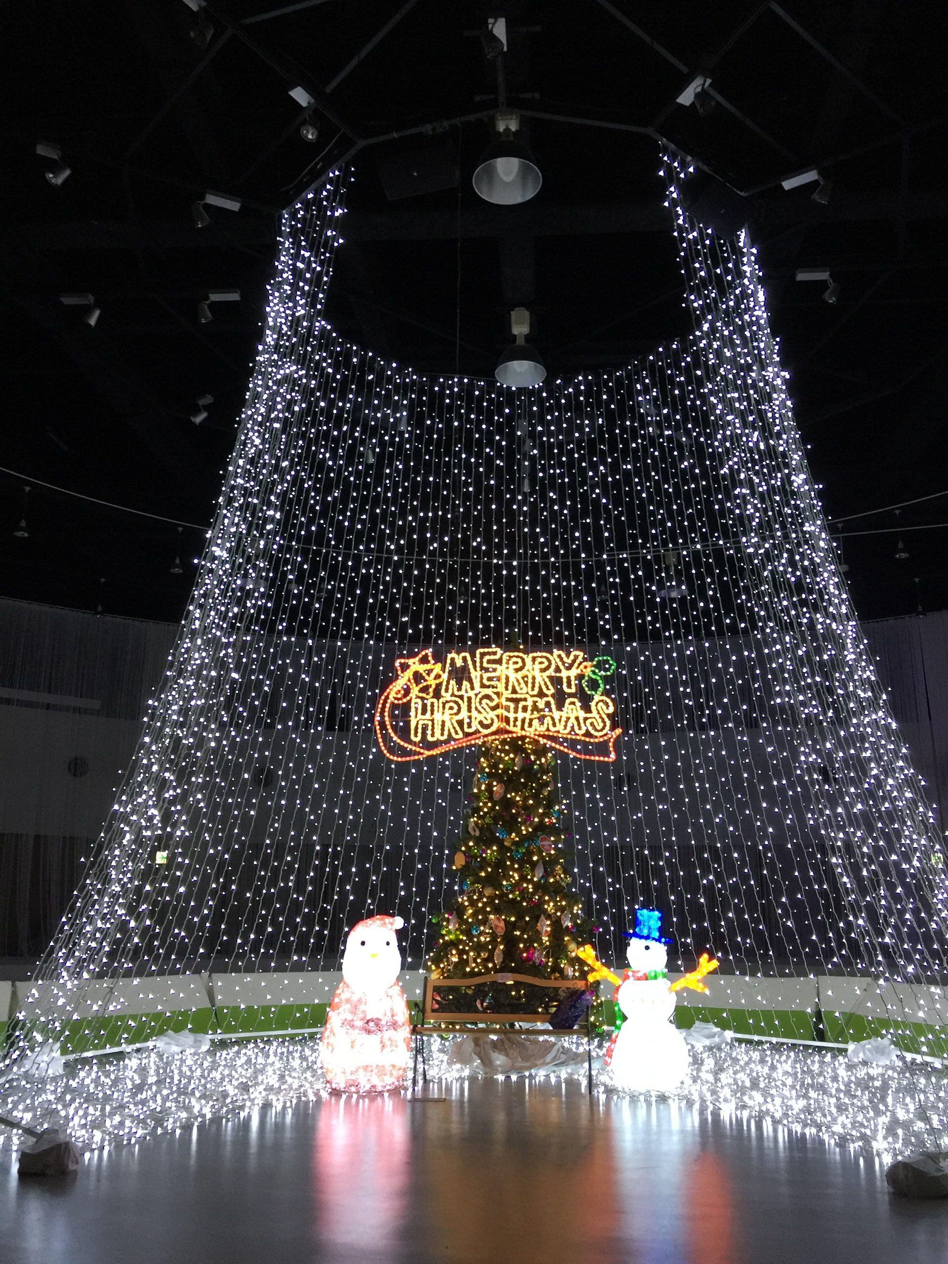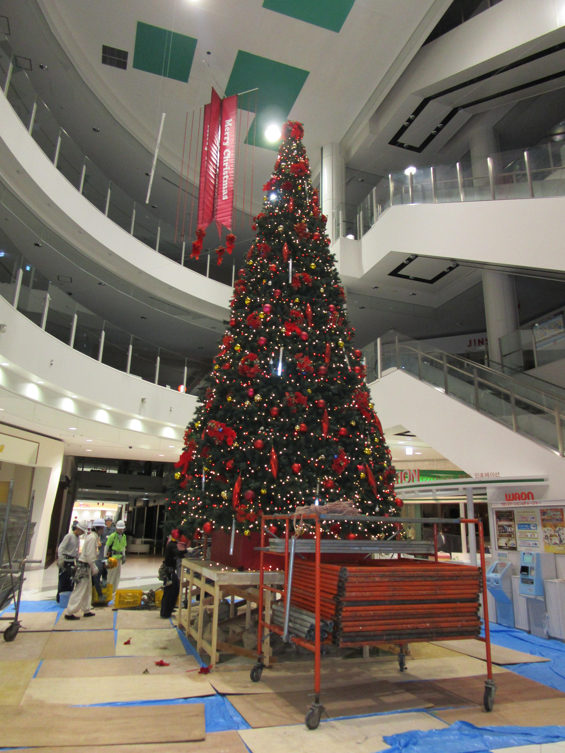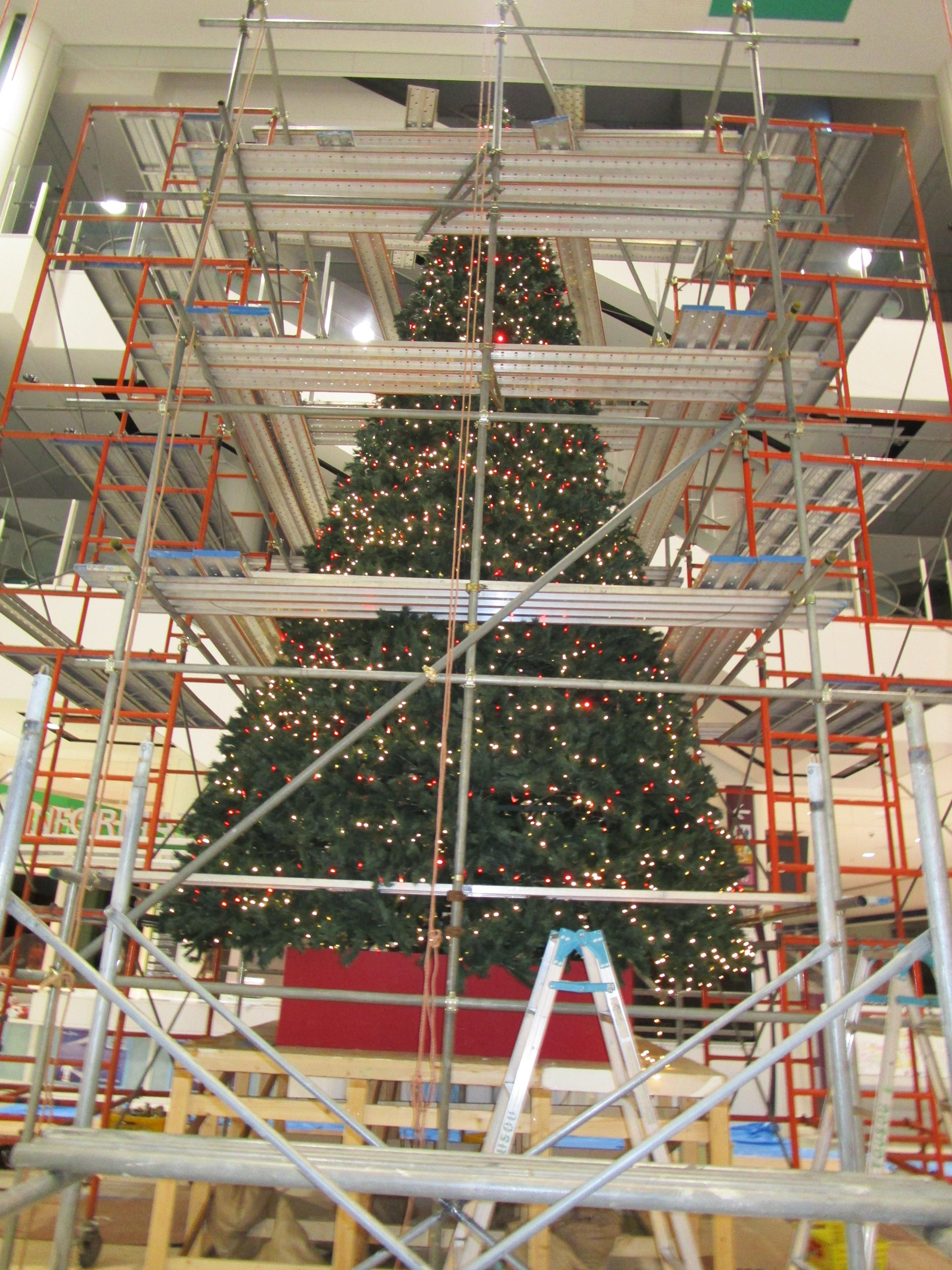 ショッピングモール営業終了後からスタートして、足場の搬入、足場の設置、クリスマスツリーの施工、足場解体、搬出まで、翌朝の営業開始までに完成します。
